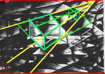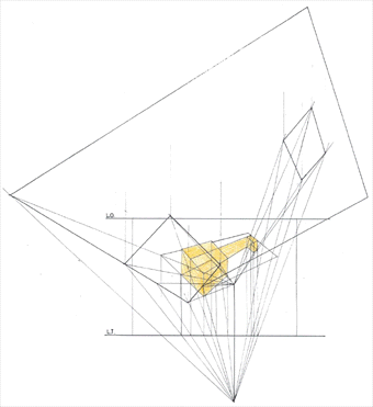 Poi per trovare l'altezza dei volumi, dai punti assonometrici che mi descrivevano le piante dei solidi ho tracciato le perpendicolari, andando ad incontrare la linea che dagli "occhi" dell'osservatore passa per lo spigolo superiore del volume prospettico. |
