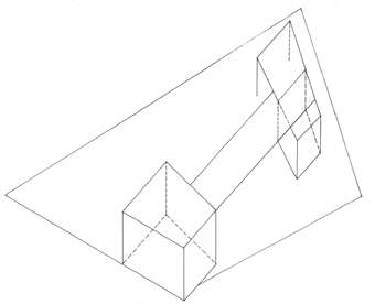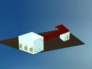 | Vista laterale del volume inferiore, nel quale spiccano le finestre "liberty", e la pensilina che ne richiama la matericità. | Questa vista assonometrica corrisponde a quella ottenuta dal dipinto con il processo anamorfico. |