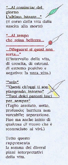 Dove vai? chi ti chiama? Lunge dai cari tuoi, bellissima donzella? Sola,peregrinando, il patrio tetto si' per tempo abbandoni? a queste soglie tornerai tu? farai tu lieti un giorno questi ch'oggi ti son piangendo intorno? Asciutto il ciglio ed animosa in atto, ma pur mesta sei tu. Grata la via o dispiacevol sia, tristo il ricetto a cui movi o giocondo, da quel tuo grave aspetto mal s'indovina. Ahi ahi, né già potria fermare io tesso in me, né forse al mondo s'intese ancor, se in disfavore al cielo se cara esser nomata, se misera tu debbi o fortunata. Morte ti chiama; al cominciar del giorno L'ultimo istante. Al nido onde ti parti, non tornerai. L'aspetto de' tuoi dolci parenti lasci per sempre. Il loco a cui movi, è sotterra: ivi fia d'ogni tempo il tuo soggiorno. Forse beata sei; ma pur chi mira, seco pensando, al tuo destin, sospira. Mai non veder la luce era, credo, il miglior. Ma nata, al tempo che reina bellezza si dispiega nelle membra e nel volto ed incomincia il mondo verso lei di lontano ad atterrarsi; in sul fiorir d'ogni speranza, e molto prima che incontro alla festosa fronte i lugubri suoi lampi il ver baleni; come vapore in nuvoletta accolto sotto forme fugaci all'orizzonte, dileguarsi così quasi non sorta, e cangiar con gli oscuri silenzi della tomba i dì futuri, questo se all'intelletto appare felice, invade d'alta pietade ai più costanti il petto. .................................