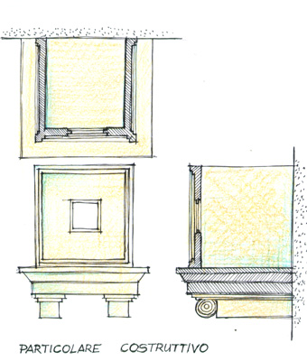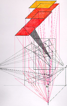 Questo e' il procedimento grafico che permette di trasformare una prospettiva in assonometria. Lo scopo del nostro lavoro partendo dal quadro di partenza interpretato come visuale prospettica , e' appunto ottenere uno spazio architettonico misurabile nelle tre dimensioni la cui rappresentabilita' e' garantita dall' assonometria. Fissata la linea dell' orizzonte sul quadro di partenza , stabiliti i punti a terra e la distanza dell' osservatore e' possibile proiettare una figura in assonometria cavaliera.