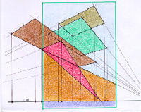 Nella figura a sinistra si e' voluto cercare la struttura della composizione, infatti evidenziando le linee principali si ottengono i confini di ipotetici piani nello spazio. Osservando il quadro in posizione orizzontale si percepisce uno spazio tridimensionale che si sviluppa planimetricamente lungo un' area quadrangolare con i due lati maggiori consecutivi, mentre la scansione verticale e' determinata da tre setti dalla forma irregolare. Ho trovato piu' interessante studiare il quadro in posizione verticale, dove con una leggera correzione dell' inclinazione delle linee di fuga, si puo' osservare la sovrapposizione tridimensionale di tre piani orizzontali rettangolari con la presenza di un quarto pino ortogonale avente la funzione di "puntone" rispetto al piano orizzontale inferiore.