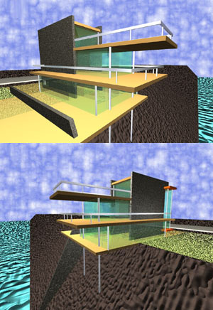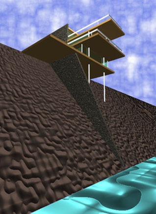 Il progetto di una ipotetica casa sul mare distribuita su tre livelli, é stato modellato con il programma form.Z il quale ha permesso anche di renderizzarne le immagini dai vari punti di osservazione. Gli slanciati aggetti orizzontali in cemento armato sono retti da due grossi setti verticali e da una coppia di pilastri a sezione circolare.