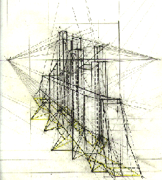 L'immagine che ho voluto ricavare dal quadro o, meglio, l'architettura che ho "visto", rappresenta una sorta di "cittadella della Montagna" futuristica, immaginata realizzata con materiali non proprio del tutto usuali; le renderizzazioni della pagina successiva mostrano proprio queste caratteristiche.