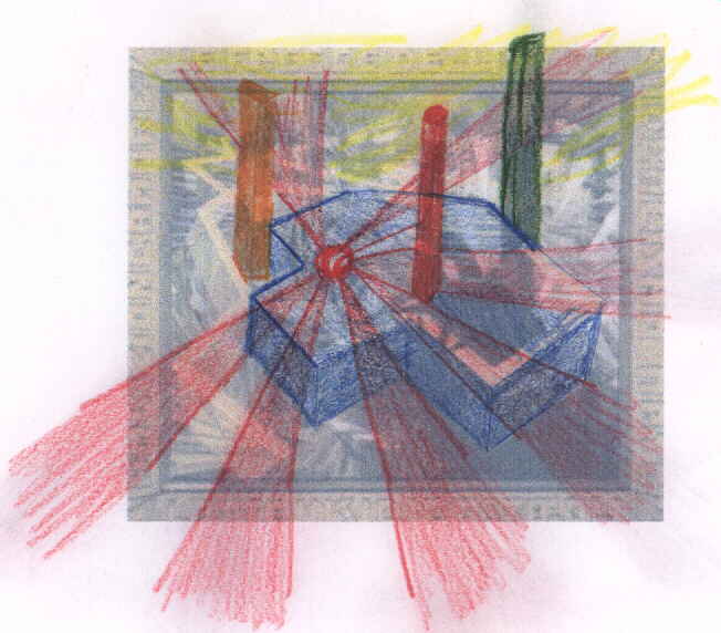 Le chiome che dipartono da queste grandi torri mi suggeriscono l'idea di grandi masse di fumi che dipartono e vagano, offuscando la visione del quadro. Un altro elemento caratterizzante e quella palla rossa che come un magnete attira le "frecce della vita", Balla. L'effetto di ombre e luci che crea il metro di legno, serpeggiando nel quadro, contribuisce alla creazione di pieni e di vuoti che danno consistenza al dipinto. |