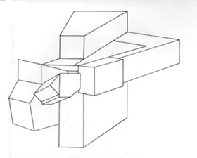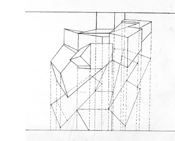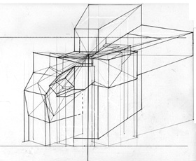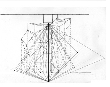 Estratti i volumi dal loro immaginario scenografico, inizio con lo studio della loro visione prospettica, ricostruendo i passaggi precedenti e analizzando la posizione dell' osservatore, l' appoggio a terra , le altezze, fino a giungere alla rappresentazione assonometrica .