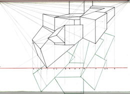 Il primo studio è quello di considerare il disegno ottenuto dall' astrazione del quadro come rappresentazione tridimensionale a tutti gli effetti, quindi con una costruzione geometrica definita da punti di fuga, punti a terra e punto di vista.