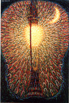 Il triangolo è la forma geometrica che esprime il movimento e Balla già lo aveva impiegato nel suo primo quadro futurista Lampada ad arco del 1909/10 (foto 7) per rappresentare l'irradiarsi incandescente della luce come in tante punte di freccia. In questo dipinto il tema è piuttosto Marinettiano: Uccidiamo il chiaro di luna. L'avvento della luce elettrica, simbolo del progresso e del futurismo che fa impallidire e scomparire il chiaro di luna, simbolo del romantico "passatismo". Nelle compenetrazioni irridescenti invece l'uso del triangolo è puramente non figurativo e pone Balla tra i precursori dell'astrattismo.