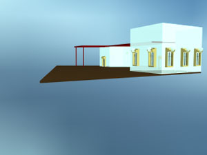 | Vista laterale del volume inferiore, nel quale spiccano le finestre "liberty", e la pensilina che ne richiama la matericità. | Questa vista assonometrica corrisponde a quella ottenuta dal dipinto con il processo anamorfico. |