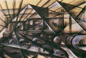 Ricordando che per i futuristi il concetto fondamentale dell' arte è il movimento, inteso come semplice spostamento nello spazio di un oggetto, ho osservato il dipinto immaginando tale come la riproduzione da parte del pittore di un ambiete tridimensionale, il qule si trovandosi all'interno di esso, risentiva di sensazioni molto forti.
