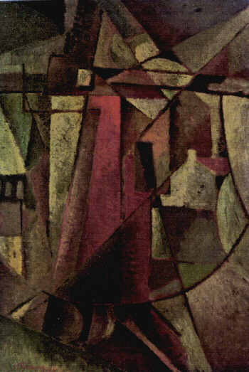 Questo quadro futurista suggerisce un paese arroccato su una collina,