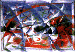 L'opera e` stata considerata perche` si presta a una lettura tridimensionale.Sono, infatti, presenti contemporaneamente elementi reali,quali un paesaggio collinare e un cielo azzurro come sfondo,a cui si sovrappongono elementi evocativi della velocita`di un'autoe del rumore da essa prodotto.Quest'ultimo, rappresentato con segni incrociati, si confonde con un moltiplicarsi di linee e piani che genera il movimento.Il passaggio dell'auto implica, inoltre, un'idea di tempo, di percorso compiuto nello spazio del quadro, di Quarta Dimensione.