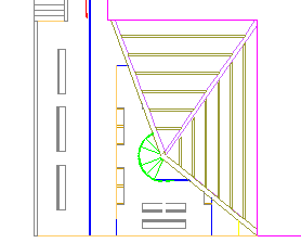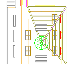 Dalla vista in pianta sono ben visibili tutti gli elementi architettonici elaborati nel progetto, la scala a chiocciola, il piano ballatoio, le finestre, la copertura, le panchine, i pannelli espositivi e la maglia strutturale (travi e pilastri) del complesso...