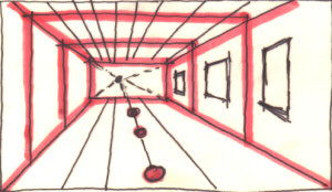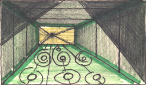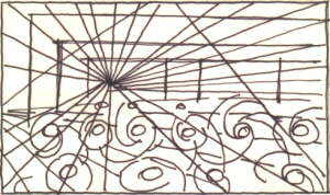 Dopo di che ho evidenziato con dei colori i possibili piani, le linee curve più vistose e alcune tra le rette, orizzontali e verticali, più utili per ricavarne un ambiente geometrico ben definito...