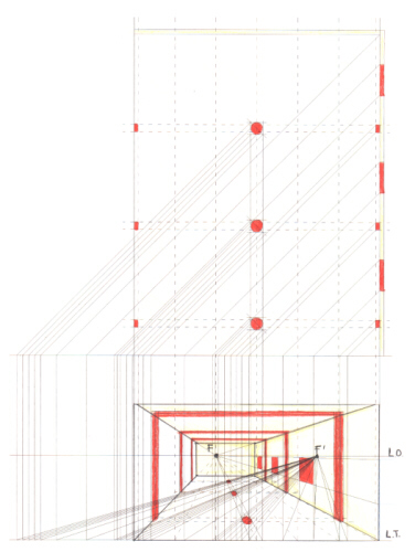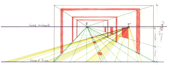 Successivamente ho prolungato dalla linea di terra, perpendicolarmente ad essa, le rette provenienti dal punto di fuga principale F, mentre ho riportato a 45° quelle provenienti dal punto di distanza ausiliario. Dall'incrocio di queste rette, relative a ciascun elemento costruttivo considerato, ho fissato i punti e tracciato la pianta reale del mio ambiente interpretato e relativo al quadro prospettico...