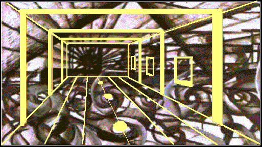 In questa prima fase si è passati dall'analisi del quadro alla rielaborazione interpretativa, cercando di intravedere un'immagine prospettica all'interno di esso. Analizzando il quadro di Balla la prima interpretazione che ne è stata fatta e stata quella di un ambiente definito da tre pareti: rispettivamente una pavimentazione inferiormente, una parete finestrata a destra e una parete cieca frontalmente. Dopo di che, attraverso l'ausilio del programma Corel Photo-Paint si è cercato di intravvedere degli elementi architettonici all'interno di questo spazio: da qui, la sequenza dei tre portali generati dall'intersezione delle rette orizzontali principali con quelle verticali e l'individuazione a terra di cerchi nel centro del quadrante di base che possono essere interpretati come possibili pilastri di sostegno per qualche cosa che si sviluppi nei piani alti...