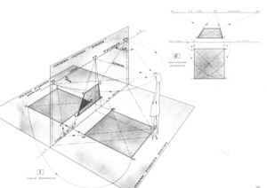 Mettendo bene in evidenza tutti gli elementi fondamentali, per la ricostruzione dell'assonometria partendo dalla base prospettica, ho poi fissato tutti i punti sulla linea di terra e le altezze su una retta verticale, considerando l'altezza del quadro come altezza di riferimento...