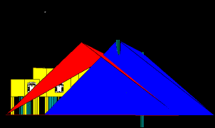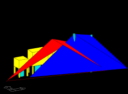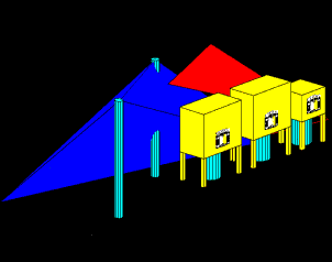 Immaginando poi che i piani gialli ottenuti siano le facce di tre edifici di forma parallelepipeda creo le altre facce e la copertura, quattro pilastri quadrati che sorreggono i rispettivi edifici ed un corpo scala cilindrico che ne permetta l'accesso. (Riferimento e' stato la Ville Savoie di Le Corbusier).