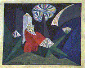 "Feu d'artifice" diventa l'esatto schema visivo di quello che si proponeva la "Ricostruzione futurista dell'universo": la creazione di un paesaggio artificiale ed astratto a coni, piramidi, poliedri, spirali di monti, fiumi luci, ombre.
