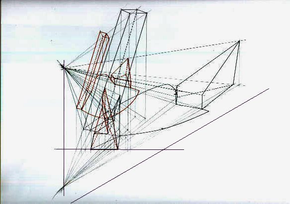 DALLA VISIONE PROSPETTICA (il tratto rosso) HO COSTRUITO L'ASSONOMETRICA (tratto nero) ATTRAVERSO LA RESTITUZIONE EVIDENZIATA CON IL TRATTO FINE