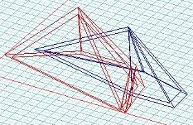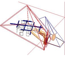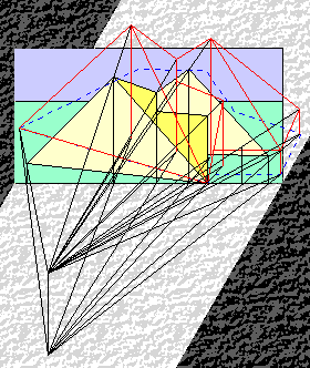 Il passaggio dalla rappresentazione prospettica a quella assonometrica ha rappresentato il punto di svolta dell'intero processo progettuale, dal momento che permetteva di trasfor- mare tutte le misure in numeri puri, direttamente rilevabili, con i quali sarebbe stato possibile costruire lo spazio architettonico valutandone correttamente le dimensioni. Qui a fianco ho illustrato sintetica- mente il passaggio grafico: l'ogget- to giallo è il quadro prospettico, in nero. sono . rappresentati .i . raggi proiettanti che partono dall'osser- vatore,. in rosso è tracciata la re- stituzione assonometrica mentre in blu è tratteggiata la proiezione della pianta. |