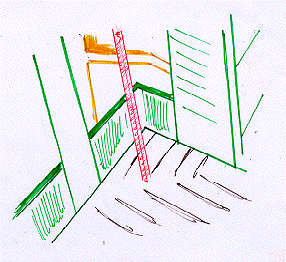 Un balconcino, rialzato da terra con il parapetto interrotto da due setti murari fra i quali si erge un sottile pilastrino, si affaccia su un ambiente costituito da articolate strutture.