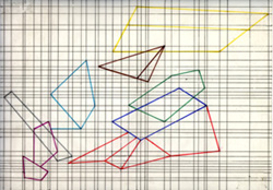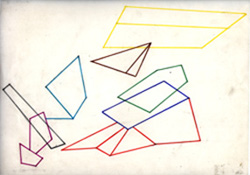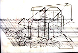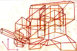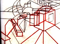 Complicando la situazione e considerando tutti gli elementi geometrici ben definiti nel quadro,tramite la costruzione ho trasformato in visione assonometrica ciņ che appariva in prospettiva secondo una mia interpretazione di volumi appoggiati a terra o sospesi o addirittura incastrati a terra ottenendo: