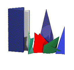 Ogni solido geometrico e' realizzato in legno e ricoperto da un tessuto colorato; alla sommita' di ogni solido vi sono altre forme variopinte realizzate in tela e illuminate in trasparenza.