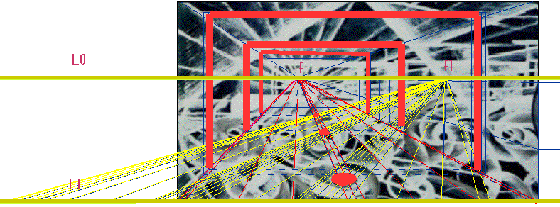In questa prima fase si è passati dall'analisi del quadro alla rielaborazione interpretativa, cercando di intravedere un'immagine prospettica all'interno di esso. Analizzando il quadro di Balla la prima interpretazione che ne è stata fatta e stata quella di un ambiente definito da tre pareti: rispettivamente una pavimentazione inferiormente, una parete finestrata a destra e una parete cieca frontalmente. Dopo di che, attraverso l'ausilio del programma Corel Photo-Paint si è cercato di intravvedere degli elementi architettonici all'interno di questo spazio: da qui, la sequenza dei tre portali generati dall'intersezione delle rette orizzontali principali con quelle verticali e l'individuazione a terra di cerchi nel centro del quadrante di base che possono essere interpretati come possibili pilastri di sostegno per qualche cosa che si sviluppi nei piani alti...