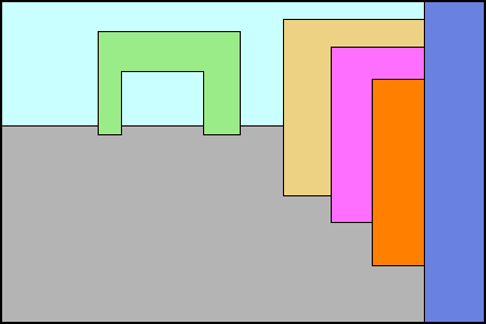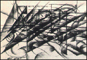 COME SI PUO' VEDERE ESSA E' COSTITUITA PRINCIPALMENTE DA DUE GRUPPI DI ELEMENTI: A SINISTRA C' E' UNA SERIE DI PANNELLI DI DIVERSE DIMENSIONI PROBABILMENTE BIDIMENSIONALI E IN CENTRO UN ELEMENTO CHE PUO' ESSERE RICONDOTTO AD UN PORTALE. LA PROSPETTIVA PUO' ADESSO ESSERE SINTETIZZATA EVIDENZIANDO LE SUE PARTI FONDAMENTALI, CON I VARI COLORI SONO EVIDENZIATE LE PARTI DI DISEGNO CHE NEL MIO SPAZIO FUTURISTA POTREBBERO RAPPRESENTARE LE PARTI EDIFICATE. LE LINEE DI COLORE NERO RAPPRESENTANO CHIARAMENTE LA PROSPETTIVA CENTRALE CHE DEVE ESSERE SCOMPOSTA PER PASSARE POI ALL' ASSONOMETRIA. IL PASSAGIO DALLA PROSPETTIVA ALL' ASSONOMETRIA IN QUESTO CASO PRESENTA DUE PROBLEMI: IL PRIMO RIGUARDA IL PORTALE, CHE SI TROVA IN PROSSIMITA' DELLA LINEA D' ORIZZONTE, L' ALTRO PROBLEMA RIGUARDA L' IMMAGINE IN COMPLESSO: GLI OGGETTI RAPPRESENTATI IN PROSPETTIVA SI TROVANO A GROSSA DISTANZA DALL'OSSERVATORE E QUINDI IN FASE DI RAPPRESENTAZIONE ASSONOMETRICA POTREBBERO ASSUMERE DIMENSIONI RAGGUARDEVOLI E DI DIFFICILE RAPPRESENTAZIONE. LA SOLUZIONE AL PROBLEMA PUO' ESSERE QUELLA DI CONSIDERARE I VARI OGGETTI SOLLEVATI GRADUALMENTE DA TERRA, RIDUCENDO LA PROSPETTIVA AD UNA PROSPETTIVA SU UN PIANO INCLINATO.