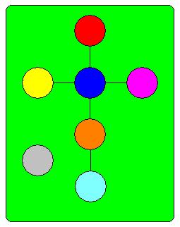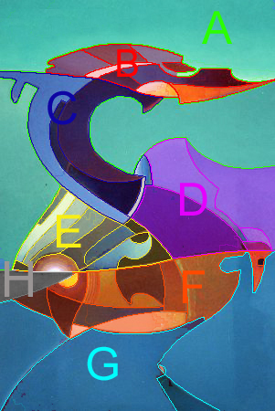 La parte circostante, quella a cui è stato applicato un filtro di colore verde e che è contrassegnata dalla lettera A, rappresenta nel mio progetto un evento che racchiude tutti gli altri, nonostante nella figura ne tocchi solo 4 su 6, in parole povere una specie di giardino che circonda una casa. All'interno di questo primo evento si posizionano tutti gli altri, a cui si accede grazie a dei collegamenti che si trovano nell'evento B (A => B), quello in rosso, nell'evento H (A => H), quello in grigio, e nell'evento G (A => G), quello in azzurro. Il sistema dei collegamenti risulta diviso in due parti distinte: da una parte l'evento in grigio, separato dagli altri, e dall'altra gli altri eventi, collegati tra loro come mostrato in figura n° 2.