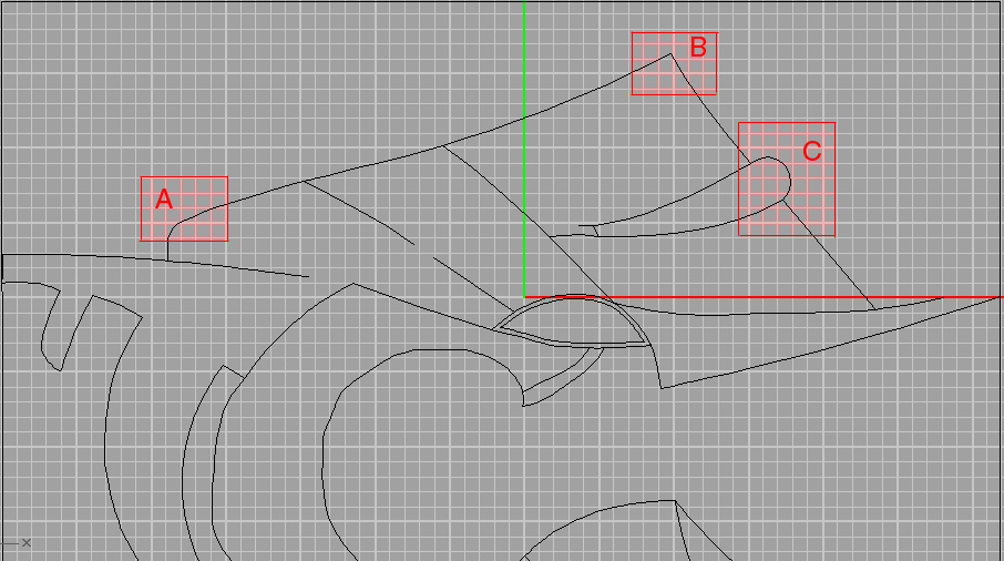 Nella zona indicata dalla lettera B, venutasi a creare dall'unione di due spigoli prolungati, ho creato uno spigolo netto,