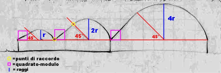 >>> Per ogni nuova semicirconferenza ho raddoppiato il raggio >>> Ho tracciato una linea a 45° dal centro della semicirconferenza, verso sinistra. >>>
