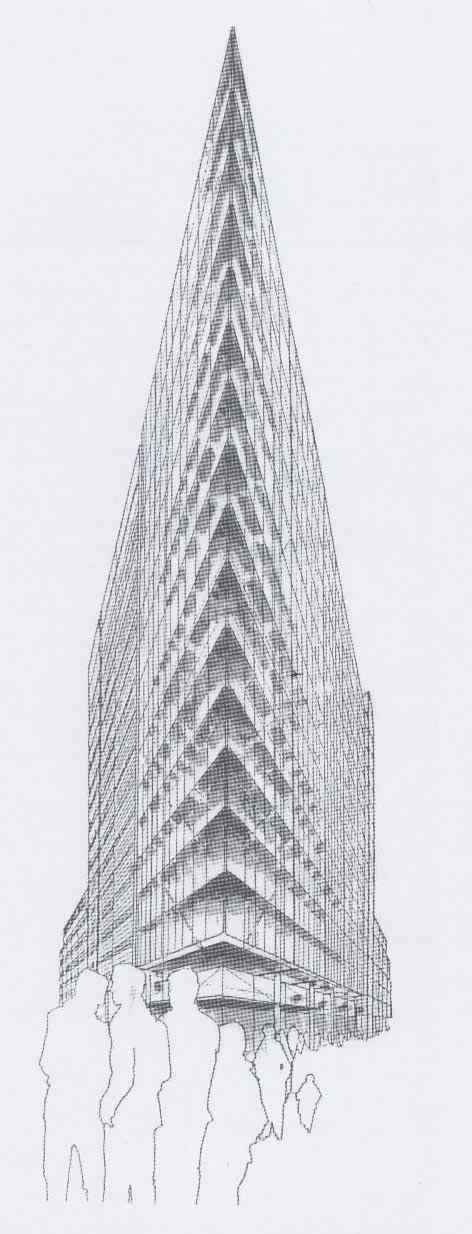 Il mio edificio dovrà essere alto e slanciato e nelle due facciate principali, quella di fronte e di retro, vi saranno dei tiranti in acciaio che sosterranno la relativa parete continua realizzata in vetro.