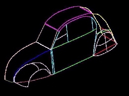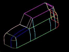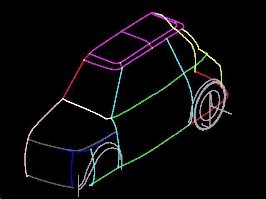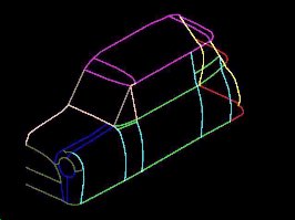 1-Giallo:profilo verticale retrotreno; 2-Rosso :profilo orizzontale retrotreno; 3-Verde chiaro: linee di cintura fiancata; 4-Azzurro: profilo verticale fiancata; 5-Magenta: tetto; 6-Arancio: profilo verticale parabrezza; 7Blu: Profilo cofano motore; 8- Marrone: profilo di sezione longitudinale cofano motore; 9-Verde scuro: profilo orizzontale del frontale; 10- Bianco: connessione cofano-parabrezza;