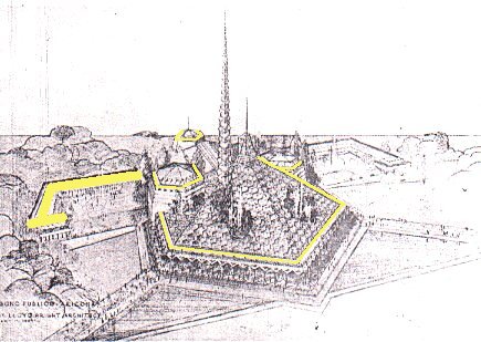 oltre questo la struttura pensata da Wright mi interessa per l'utilizzo di una grande corte irregolare aperte e l'alternativa dell' esagono al quadrato quale griglia per le grandi dimensioni.
