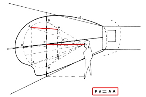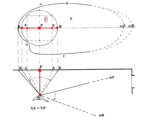 di parete percepita dall'occhio dalla distanza VP. La superficie totale b (fig.3) percepibile è limitata in alto dall'arcata sopraccigliare a , da un lato dal setto nasale n , in basso dallo zigomo z , che formano una linea d , relativamente vicina al punto P, mentre dall'altro lato tale linea è molto più lontana. |