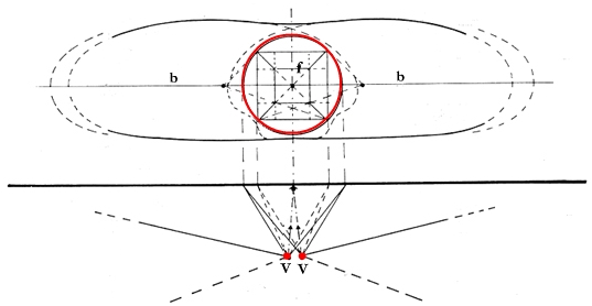 assi ottici nel punto scelto e vi si mettono a fuoco singolarmente. La parte principale della visione bioculare resta quindi un cerchio per cui il mondo esterno, ad esempio un'opera d'arte, viene ad interessare principalmente questo cerchio. In essa possiamo definire la geometria prospettica relativa alle cose che vi vediamo e che regola le diminuzioni e gli scorci. |