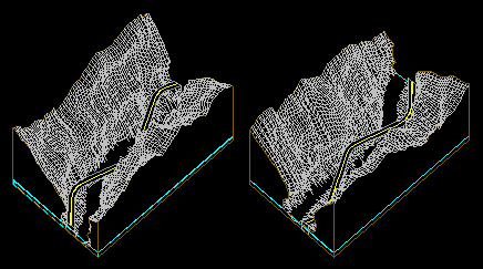 Applicando le regole formali addotte in precedenza, e quindi ipotizzando sezioni successive distanti tra loro m.2, ho creato un modello tridimensionale di uno spaccato della valle (sezione planimetrica di 120m.x 60m.), comprendente il torrente e la strada. Nelle due immagini si possono osservare due assonometrie isometriche del modello virtuale.