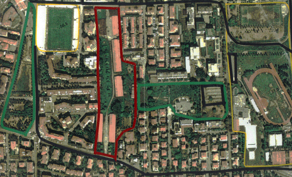 Per quanto riguarda l’area edificata che si affaccia su Via Zucchi essa viene considerata perché da noi ritenuta importante come sfondo al parco che immaginiamo tra Via Matteotti e la stessa Via Zucchi, quest’ultima si è rivelata da una nostra lettura storica dell’evoluzione del microsistema una delle strade più importanti dello stesso, più di Via Matteotti.
