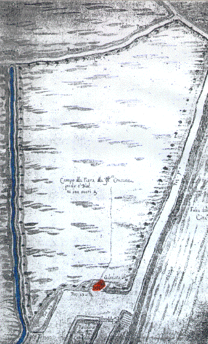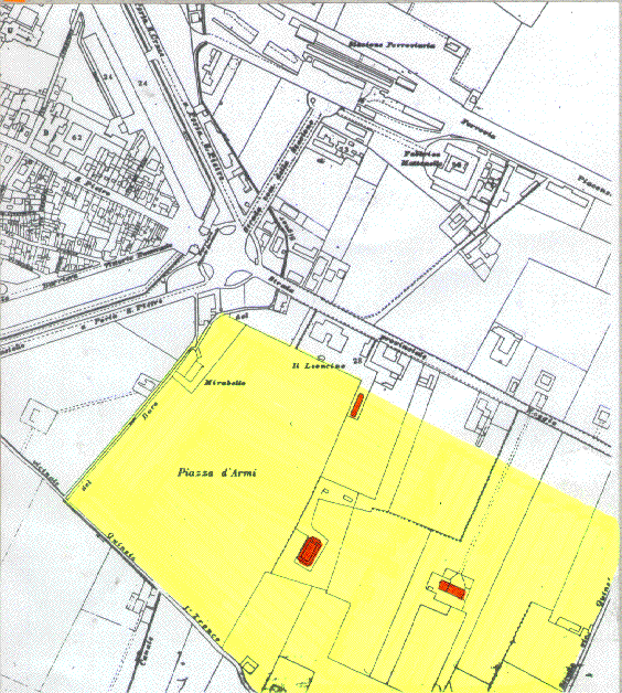 | Soglia storica 1887: iniziato il trasferimento della piazza d’armi dalla cittadella all’area che va dal Mirabello all’attuale area della polveriera. Appare un edificio circa nella zona dell’attuale parcheggio della piscina che rimane fino al 1964. | ||