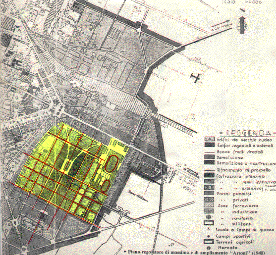 | Soglia storica 1940: Viene edificata l’area che sta tra via Matteotti e viale Risorgimento, sorgono edifici anche di fronte al Mirabello tra via Matteotti e via C. Zucchi, si sviluppano edifici residenziali anche dietro all’area del campo scuola oltre via F. Luca da Reggio. Lo stadio assume una forme più imponente. | ||