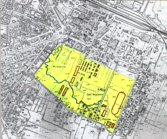 | Soglia storica 1650: la villa Mirabello viene demolita ed il parco è usato per esercitazioni militari. Si riscontra la presenza di un molino per macinare il grano, detto "del mercato o del portone", posto nei pressi dell’incrocio tra Viale Olimpia e Via Matteotti, il molino era azionato dall’acqua di un canale che scorreva lungo quella che oggi è Via Matteotti. | ||